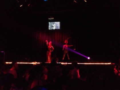 Inside, they had a funny theme of dancers dressed up in the weirdest fashions, from Cleopatra to harlequins… The crowd was pretty mixed, a bit young – or am I really getting old? Their music was great, Eurythmics, Depeche Mode… all heavily remixed, but great to dance to.