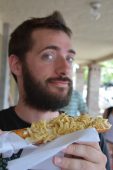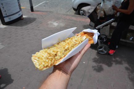 In this case, it was a dough-wrapped hot dog, or, in my case, caprese style melted cheese with tomatoes, that is baked like a panini and eaten on a stick. I got mayonnaise and fine crushed potato chips on top of that. It’s good, although not necessarily the healthiest thing on earth.